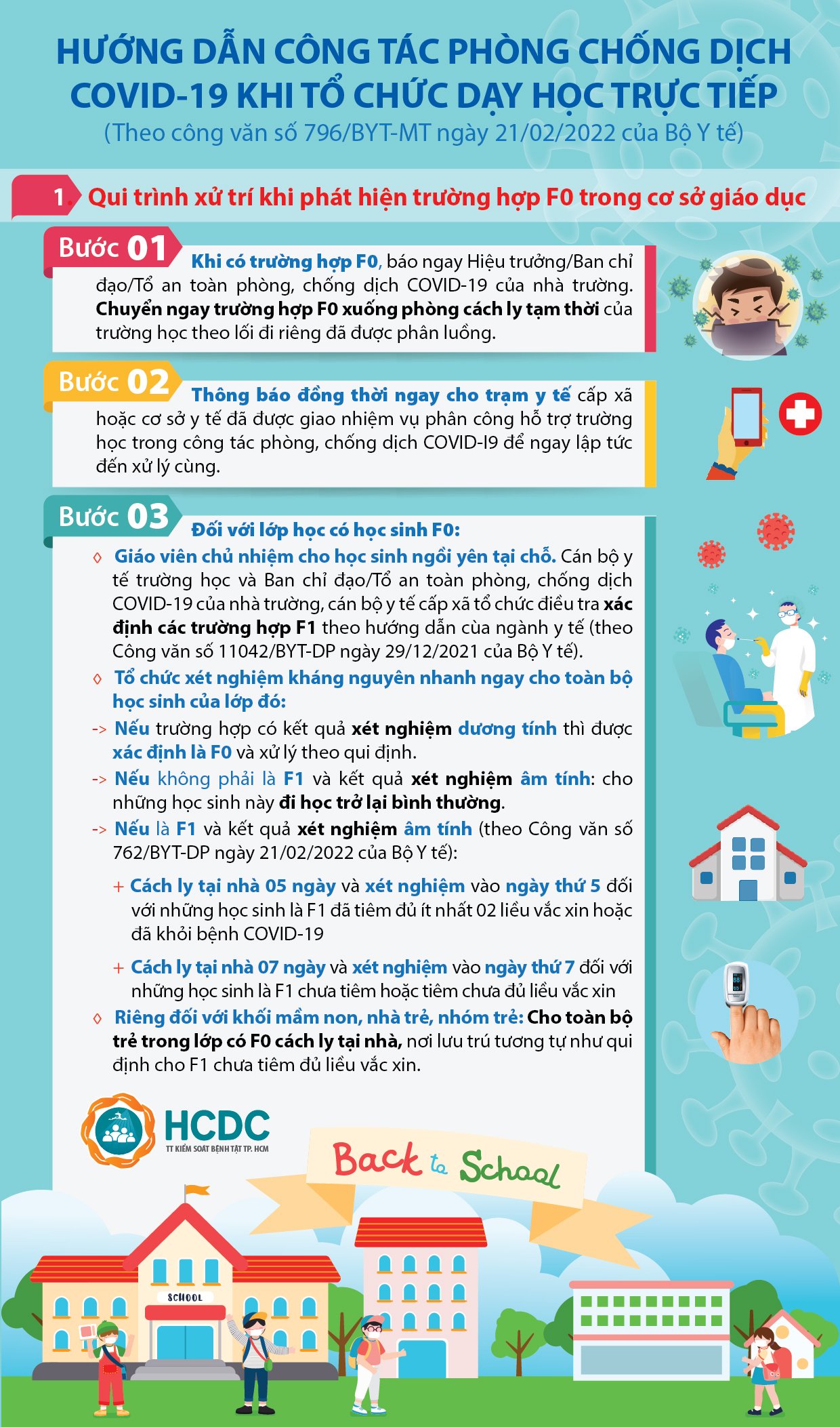 Căn cứ tình hình dịch bệnh hiện nay trên thế giới và tại Việt Nam, cũng như tỷ lệ bao phủ vắc xin phòng COVID-19 cao trên phạm vi toàn quốc. Ngày 21/02/2022, Bộ Y tế đã ban hành công văn số 796/BYT-MT xây dựng, bổ sung một số nội dung hướng dẫn phòng, chống dịch COVID-19 trong trường học nhằm tạo điều kiện thuận lợi cho cơ sở giáo dục khi tổ chức dạy, học trực tiếp.